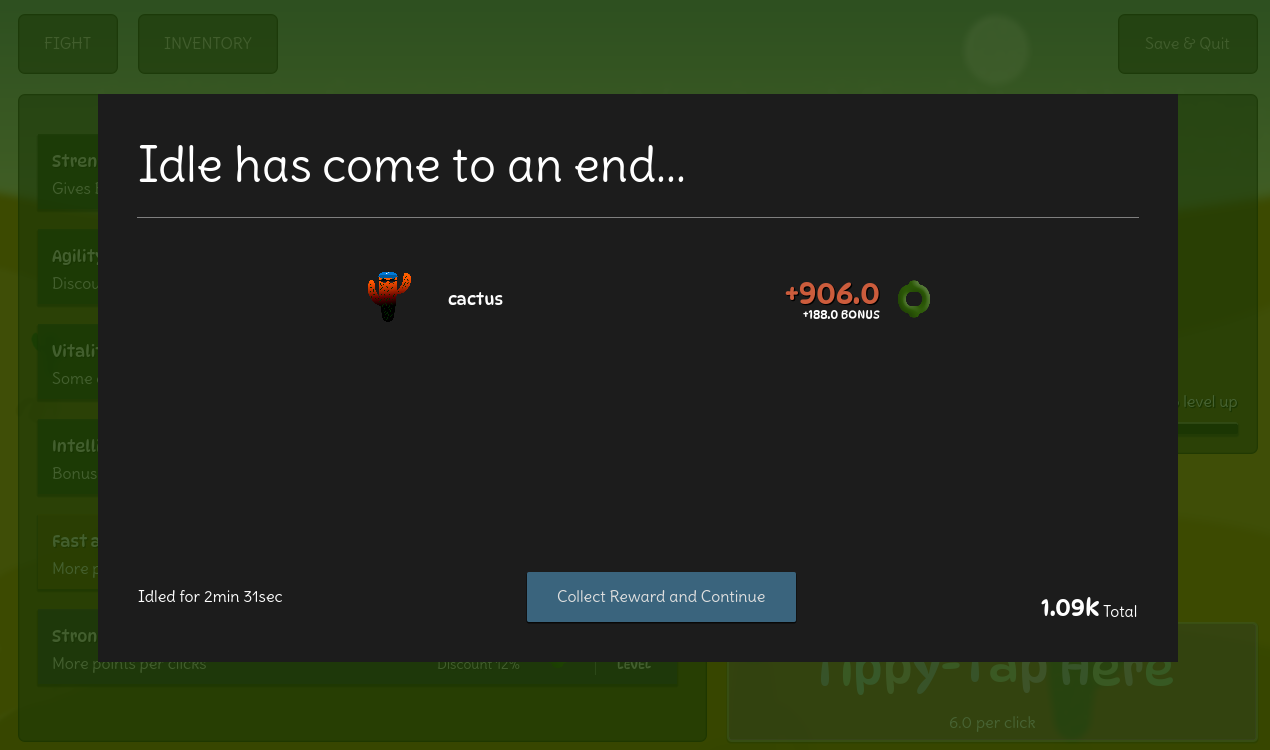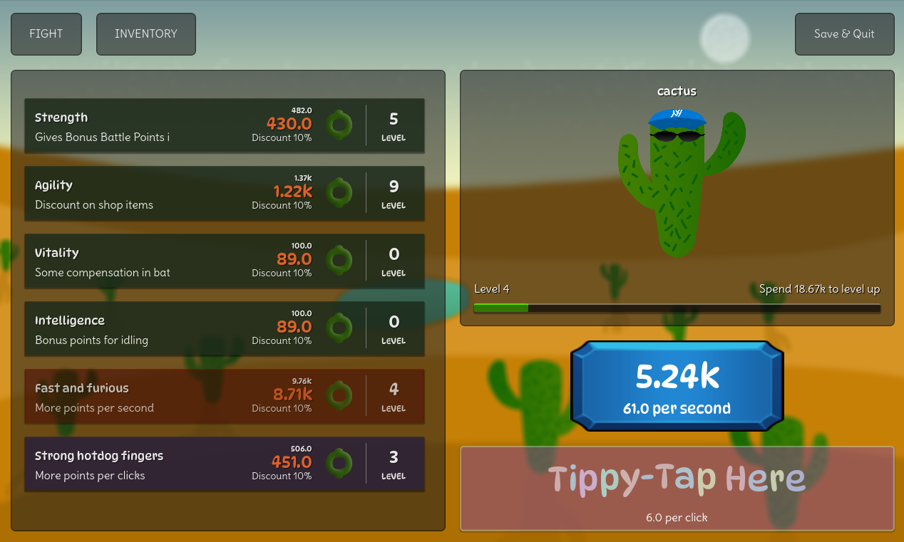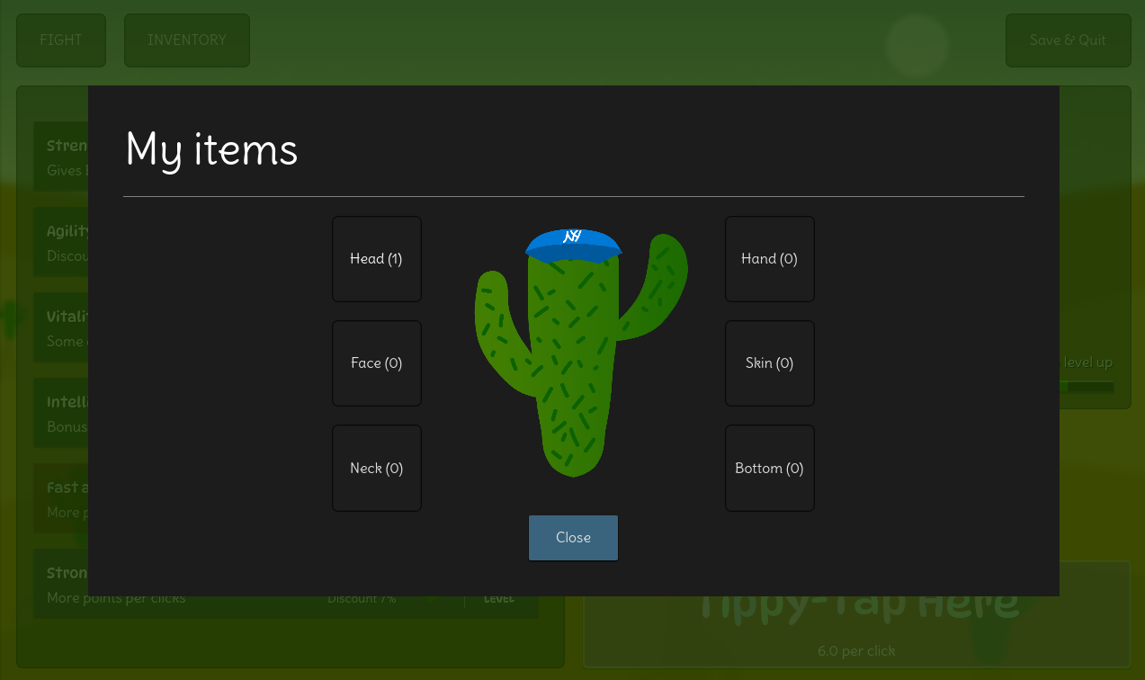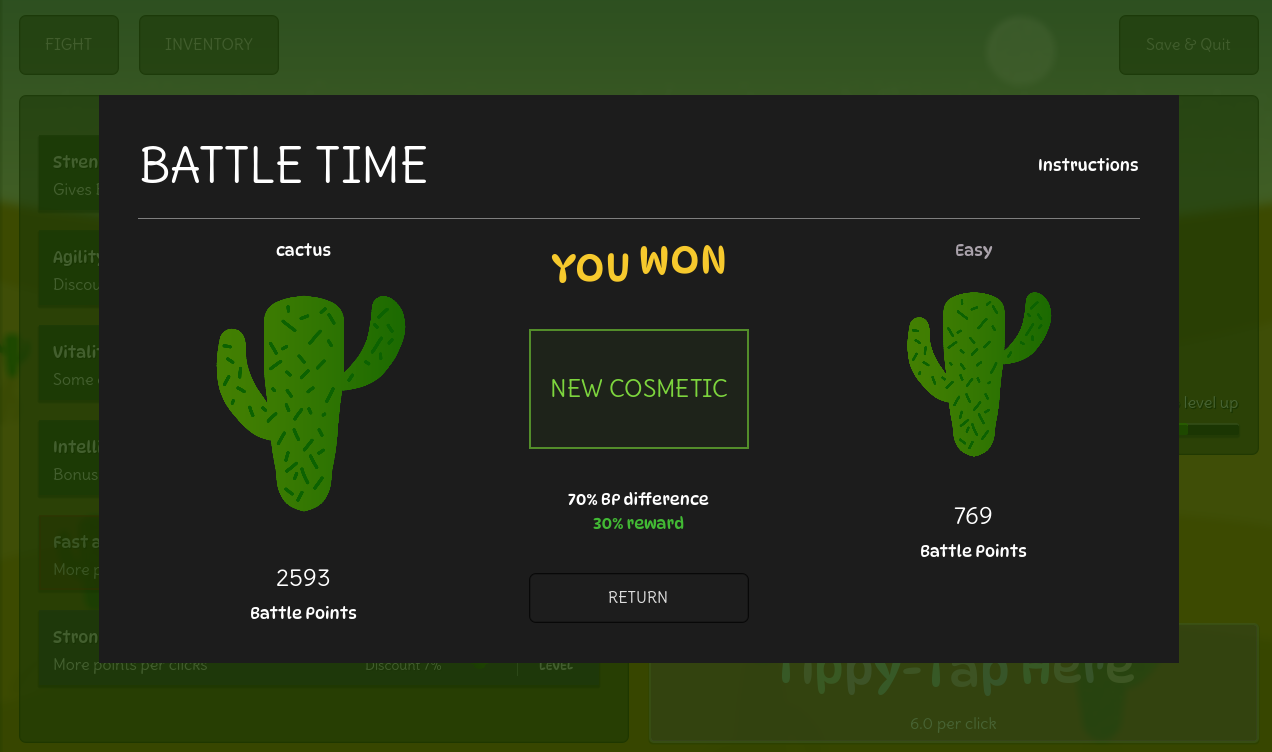 I agree on that and thanks for the comment. Unfortunately cosmetics and inventory was literally last hour addition and I had to integrate them in a way that you can at least get them. The original plan was that you would have a shop as in most RPGs where you can buy some items, including cosmetics. The original idea for a valuable reward was new cactus species instead of cosmetics and thus you would have multiple cactuses that you can idle/upgrade simultaneous.